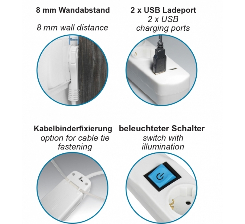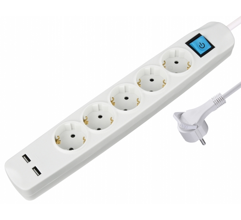 NV58-3WL weiß, 3,0m 5-fach Flach-Schutzkontakt-Steckdosen-Leiste mit 2 USB-Ladebuchsen