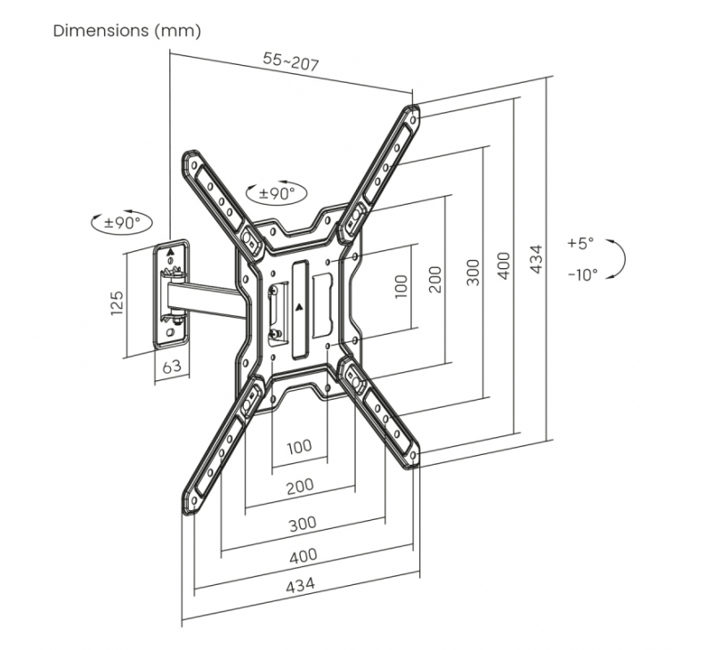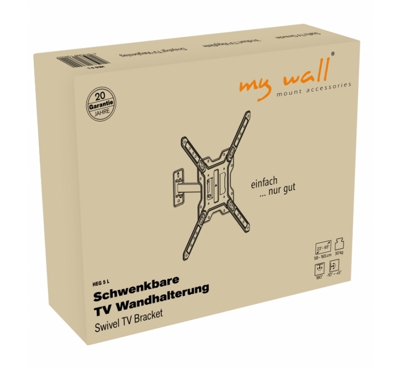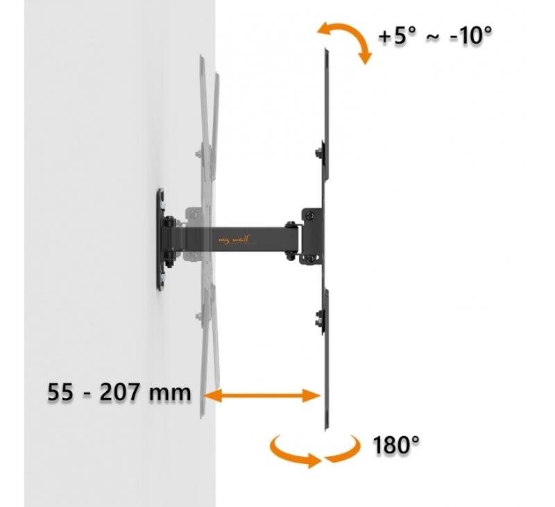 Gefertigt für Bildschirme von 23“ - 65" (58 - 165 cm), überzeugt die TV Halterung mit einer Belastbarkeit von bis zu 30 kg. Die Neigung von +5 bis -10°, ein Schwenkbereich von 180° sowie ein variabler Wandabstand von 55 bis 207 mm bieten maximale Bewegungsfreiheit. Egal ob im Wohnzimmer, Büro oder Schlafzimmer, diese Fernsehhalterung für die Wand erfüllt höchste Anforderungen an Qualität, Flexibilität und Komfort. Auch für größere Geräte mit breiten Befestigungsmustern ist sie optimal geeignet und deckt VESA-Standards von 100x100 bis 400x400 ab. Mit dieser Wandhalterung für Fernseher holen Sie das Beste aus Ihrem TV heraus, für ein modernes, funktionales und elegantes Gesamtbild.