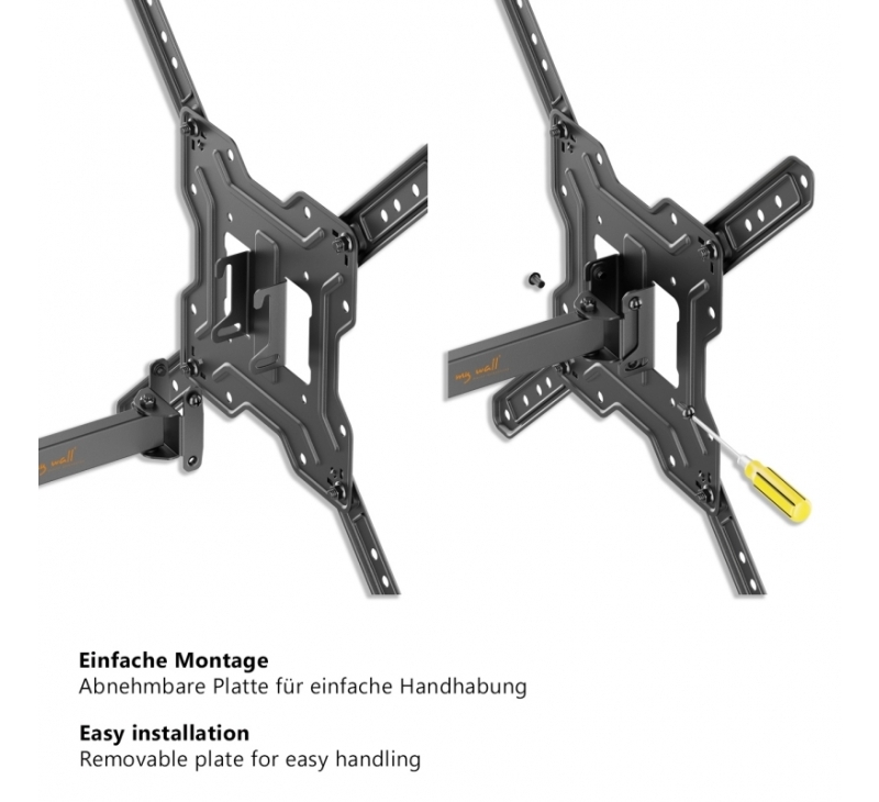 Dank ihres schwenkbaren und neigbaren Designs mit variablem Wandabstand passt sich diese Wandhalterung jeder Raumsituation an und ermöglicht immer den perfekten Blickwinkel. Die Montage gestaltet sich besonders einfach, denn die abnehmbare Platte erleichtert das Anbringen des Displays erheblich und spart wertvolle Zeit. Durch die integrierte Kabelführung bleibt alles ordentlich verstaut, für eine saubere Optik ohne sichtbare Kabel.