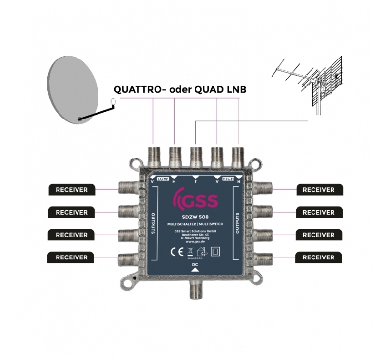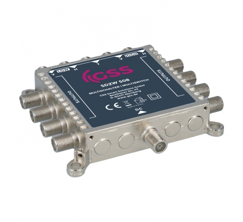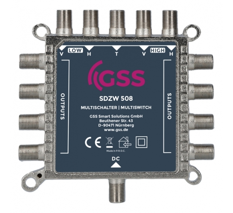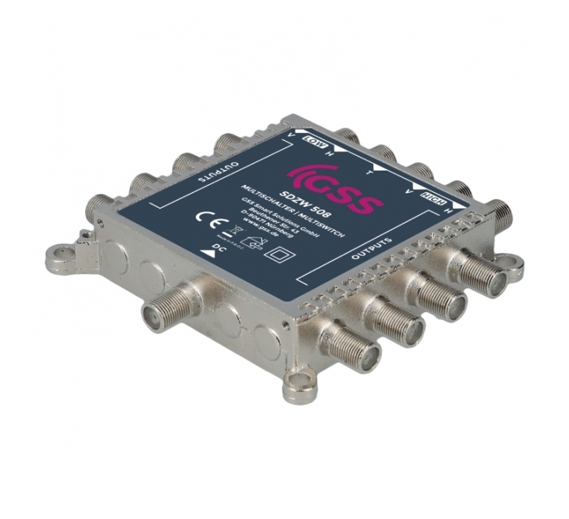 Der Multischalter GSS SDZW 508, im schicken Aluguss-Gehäuse, ist für die Verteilung von Satellitensignalen und terrestrischen Fernseh- und Radiosignalen in Hausinstallationen konzipiert.